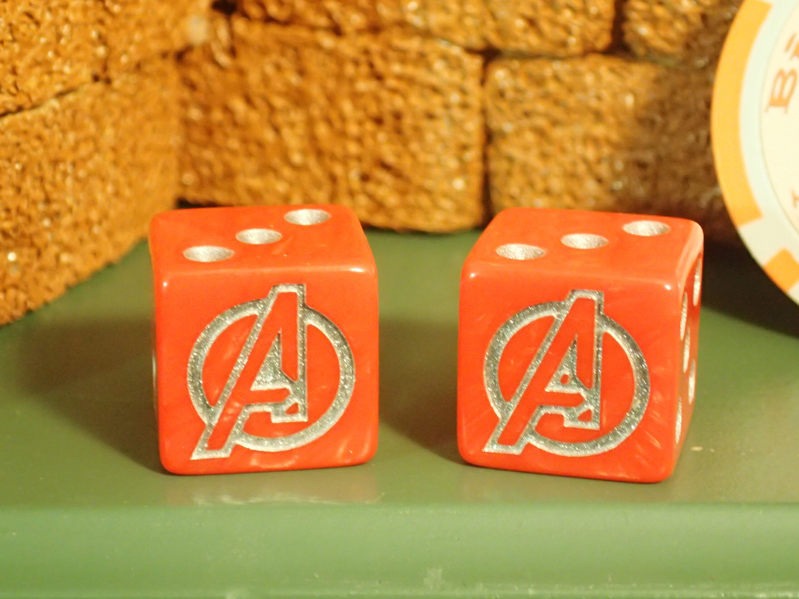 Engraved dice with the Avengers logo.